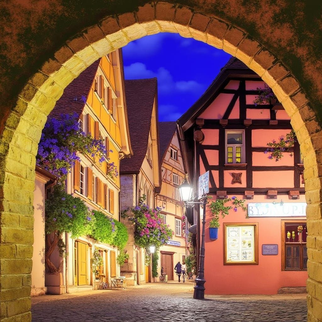 This image shows a charming street in Riquewihr, Alsace, featuring colorful half-timbered houses under a bright blue sky. The artwork blends impressionistic brushstrokes with a touch of futuristic and delicate digital art.