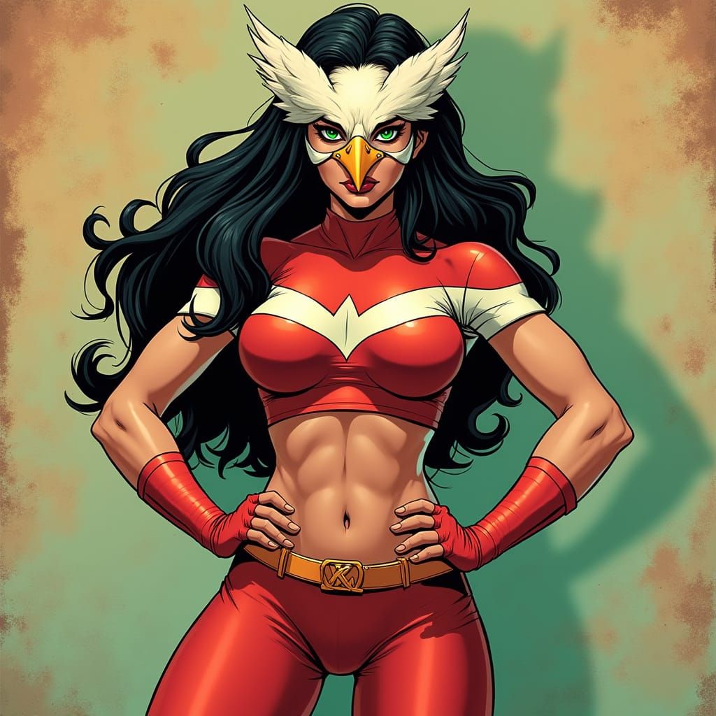 This striking image shows a confident Latina superheroine in a bold, red and green 2-piece suit, with a crisp white accent, posing with a sly smirk, against a subtle Mexican-inspired backdrop, with dynamic lines and striking chiaroscuro.