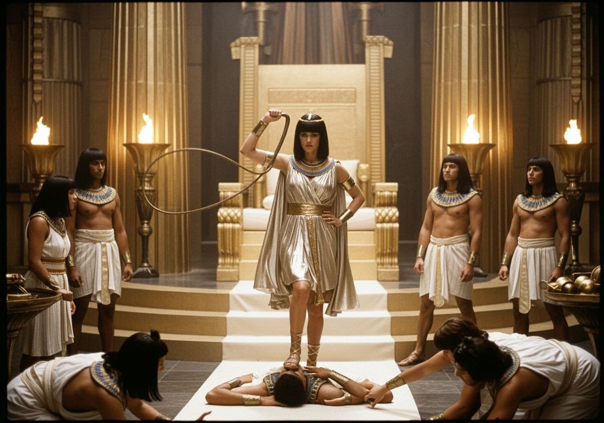 This image shows an Egyptian queen in a gold toga standing in her throne room. She is whipping servants, with cinematic lighting and dramatic color grading in a cinematic style.