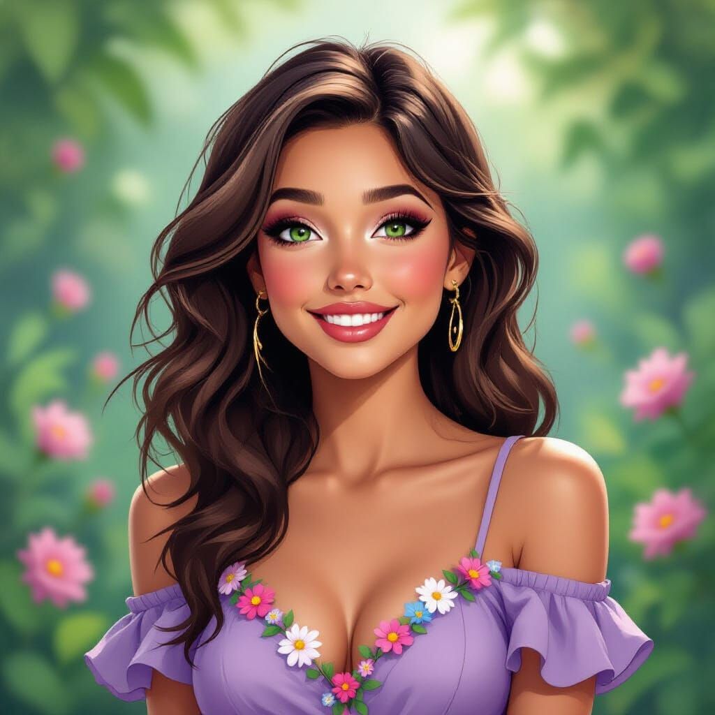 A striking picture of a brown-haired, green-eyed woman in a lilac dress adorned with garden flowers, her face lit with joy. This digital artwork features vibrant colors and intricate detailing.