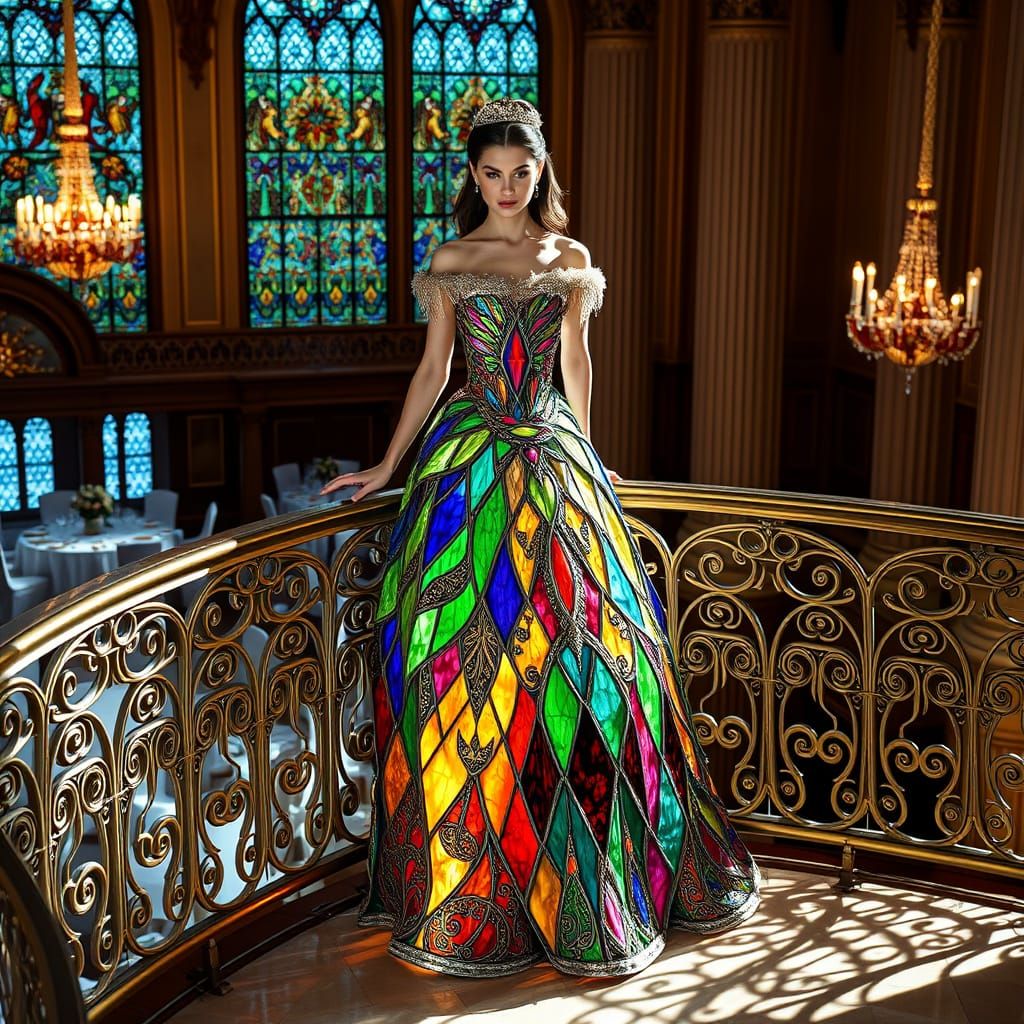 This image features a regal queen on a balcony, her gown a sculpted masterpiece resembling a stained glass cathedral window with vibrant jewel tones and silver filigree, in an Art Nouveau aesthetic.