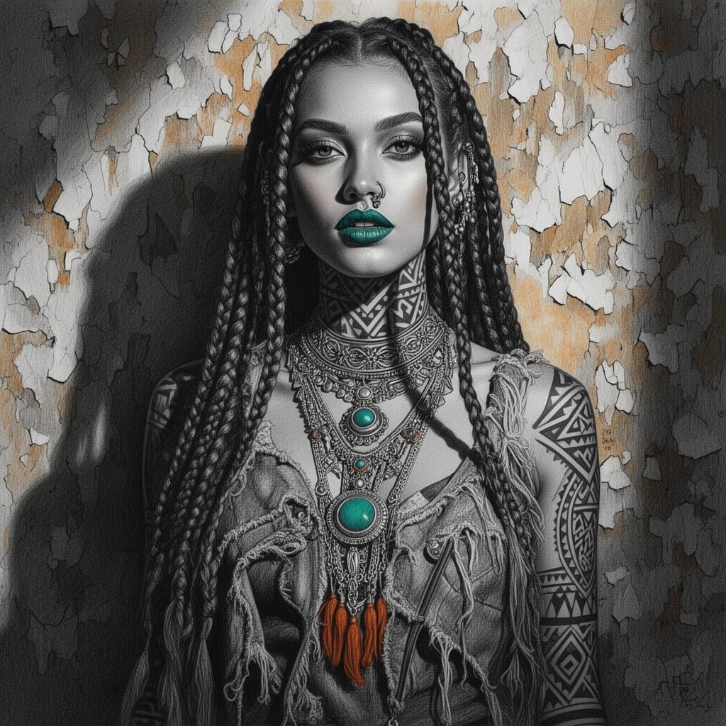 This striking image showcases a medium close-up portrait of a woman with tribal-bohemian style, detailed braids, and editorial makeup. Rendered in photorealistic graphite and charcoal fine art with dramatic lighting.