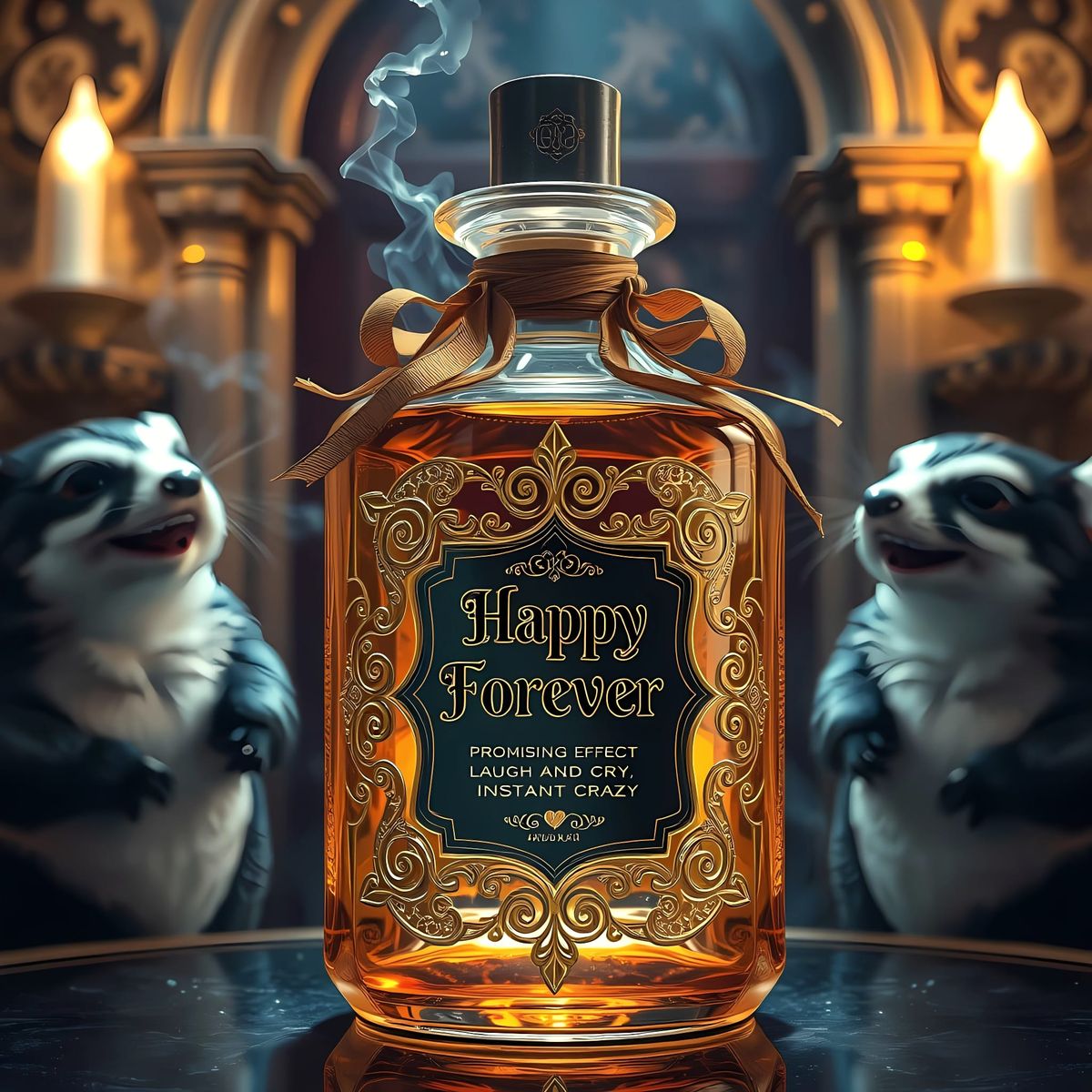 A vibrant, silver-black potion in a golden glass bottle, adorned with a Gothic motif, lace, and ribbons, emits a sweet, floral scent within a beautiful Baroque interior with 2 skunks laughing, capturing the charm and humor of this magical concoction.