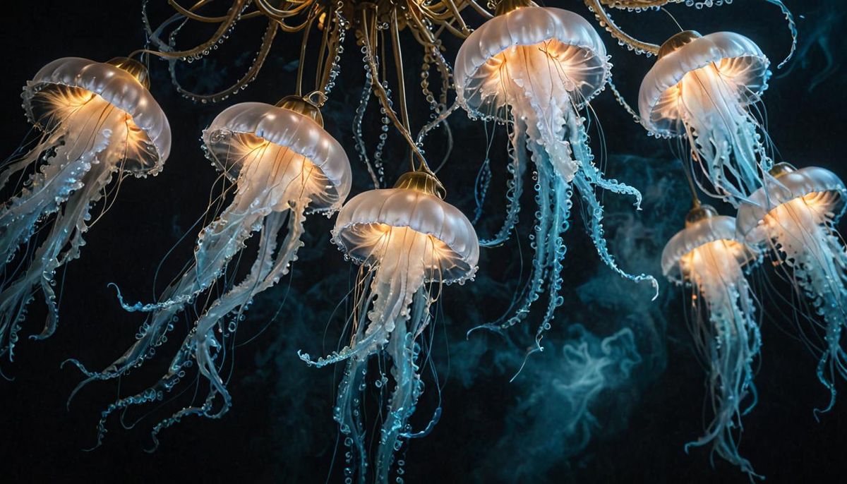 A captivating image of a jellyfish chandelier with soft, flowing tentacles in a dark, misty setting. The ethereal artwork features an iridescent color palette and shimmering, stardust-like accents.