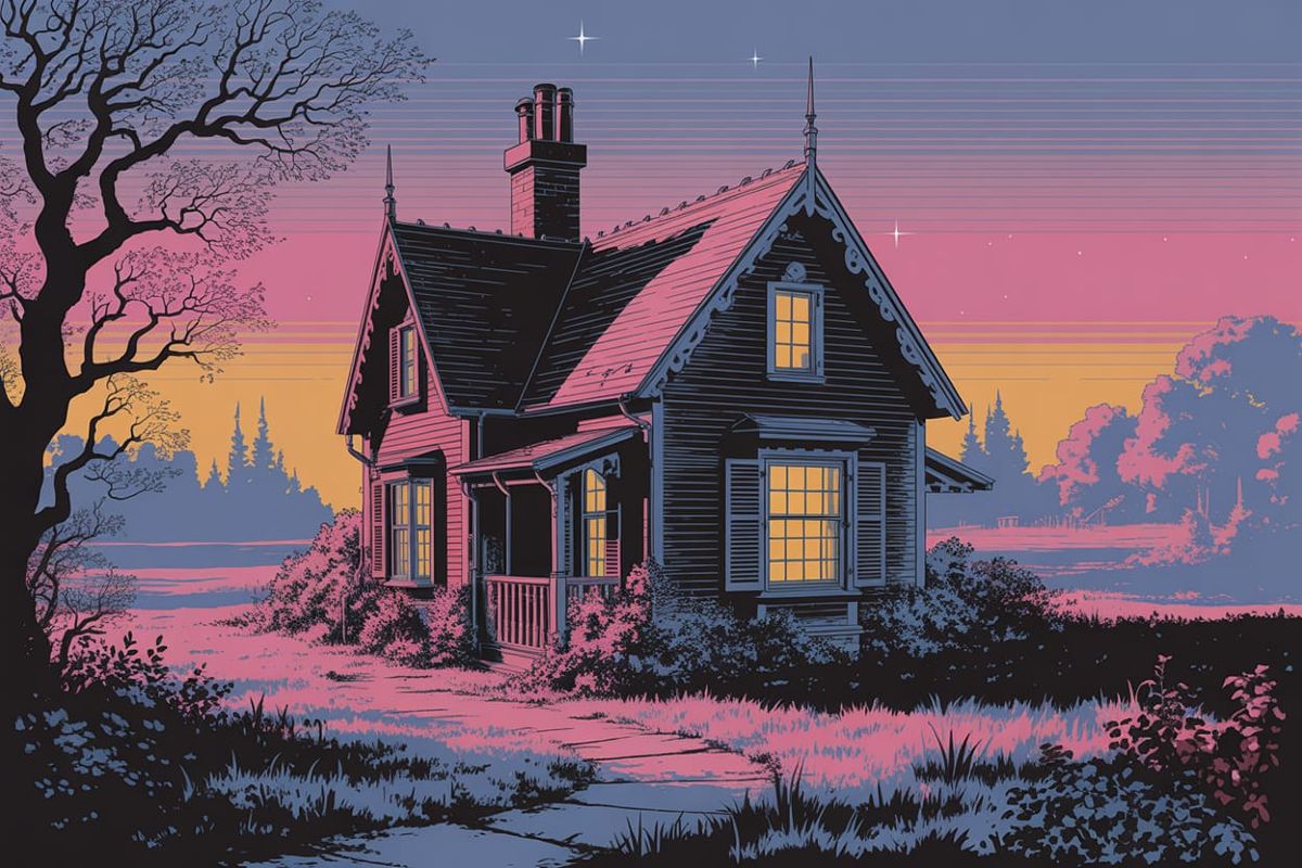 A vintage-style digital illustration of a 19th-century cottage at dusk. The hand-drawn image features laser-etched details, wide lens perspective, color gradients and reflective surfaces in a retro dungeons and dragons aesthetic.