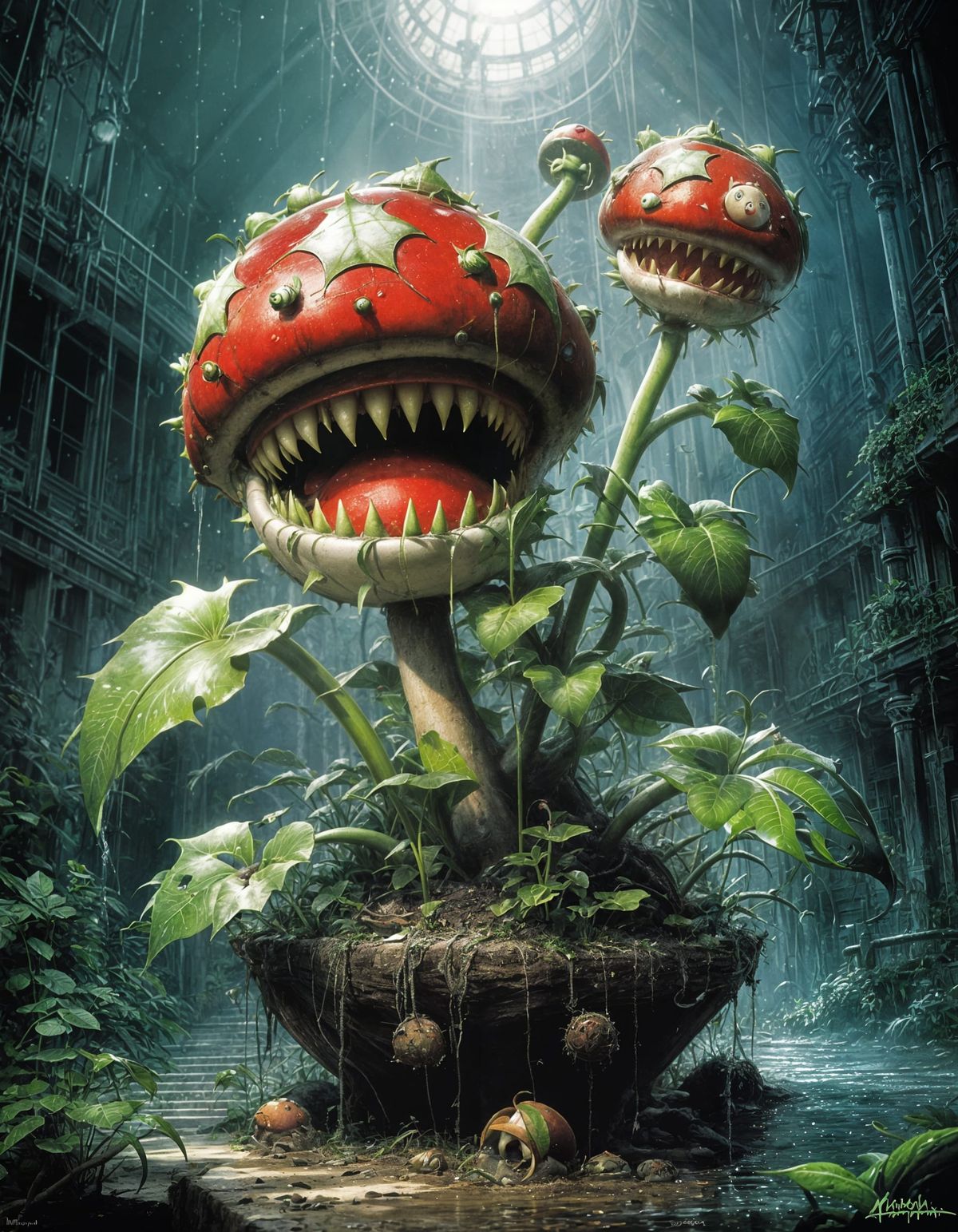 A fearsome Piranha Plant from Mario, depicted with the detailed and dramatic flair of fantasy illustration. The artwork blends realistic textures and dynamic composition.
