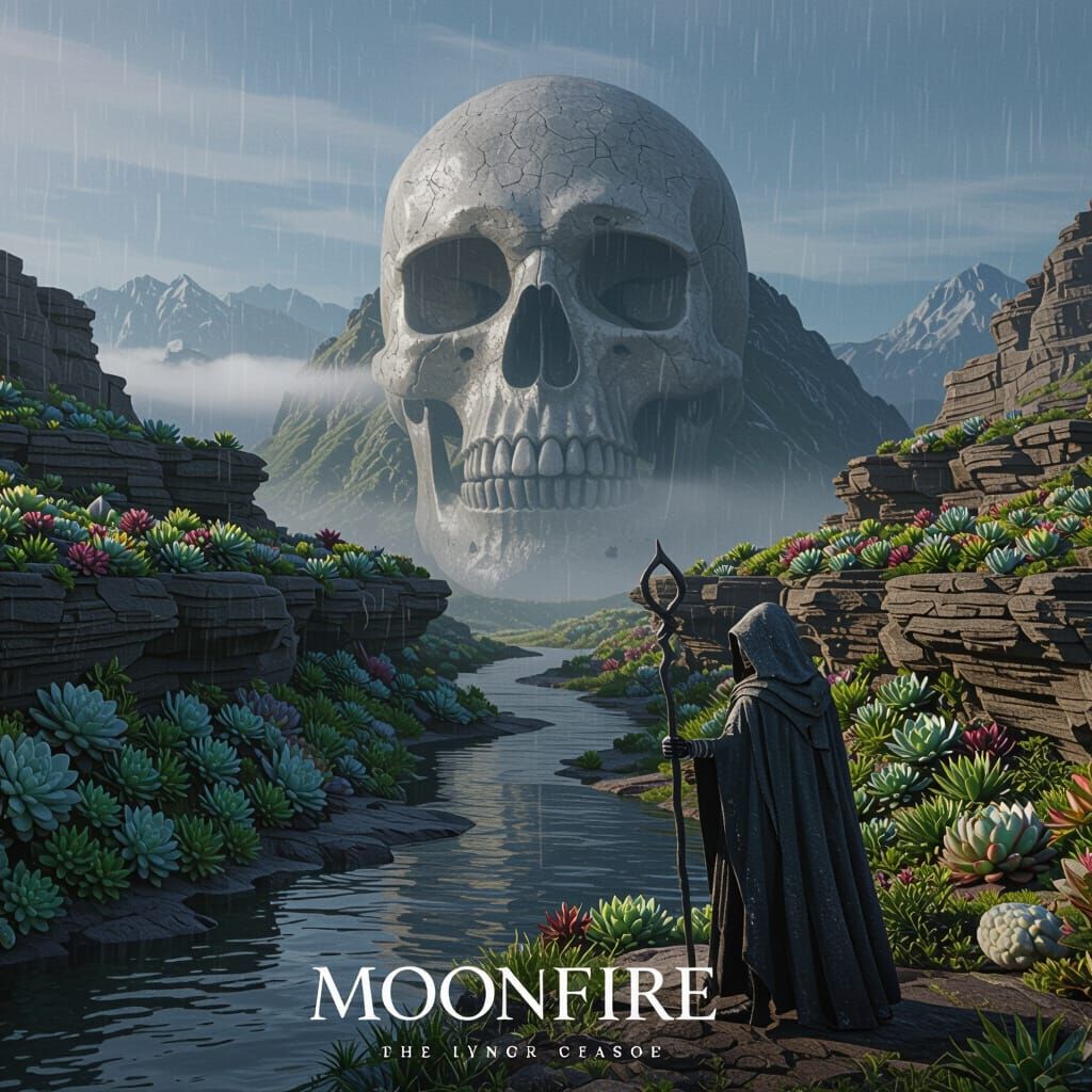 This photorealistic image depicts a majestic Skull Mountain after rainfall, shrouded in mist with a river flowing through its jaw. A skeletal guardian stands watch over lush succulents clinging to rocky ledges.