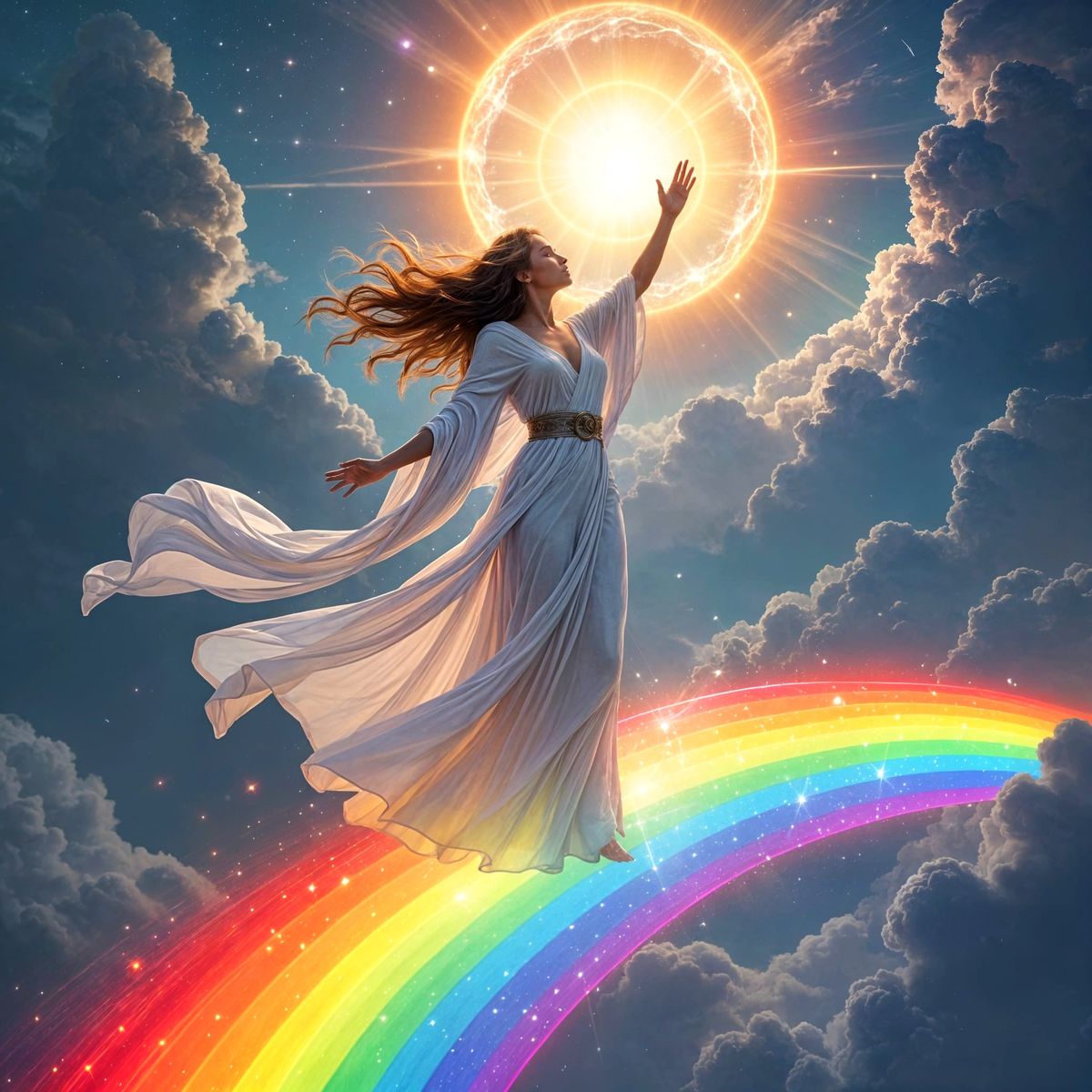 This digital artwork depicts a goddess figure on a rainbow bridge. She is summoning energy with raised hands, with cosmic energy emanating from her eyes. The image features vibrant colors and dynamic lighting.