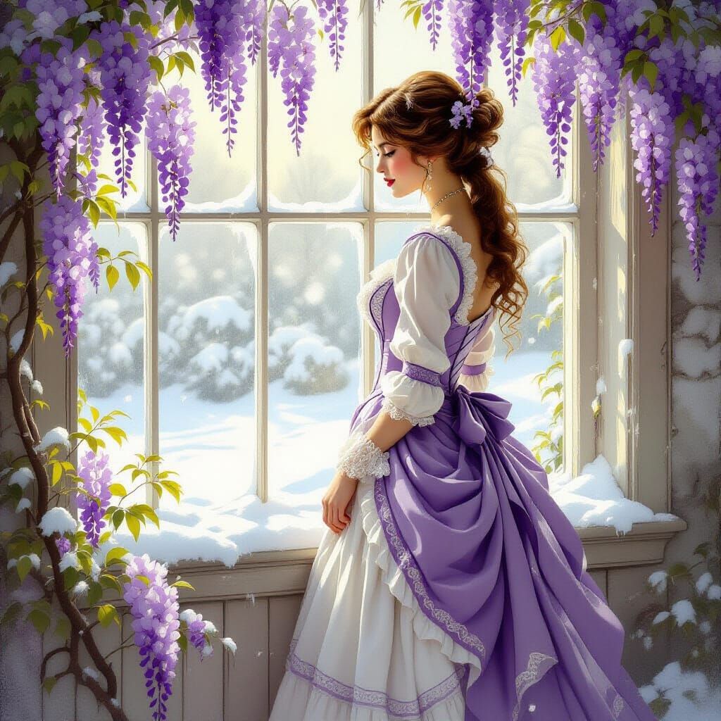 A beautiful Victorian lady in a wisteria dress stands by a snowy window, bathed in soft, golden light. This image evokes a whimsical, enchanting atmosphere similar to Beatrix Potter's style.