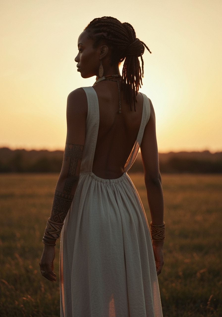 A captivating image of a slender woman with braids and ethnic tattoos standing in a serene field at sunset. Warm golden light enhances the muted, deep tones.