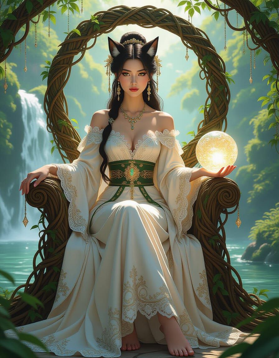 A striking picture of a kitsune woman seated on a floral throne. She is adorned with jewels and holds a glowing crystal ball, set against a backdrop of lush greenery in an art nouveau style.