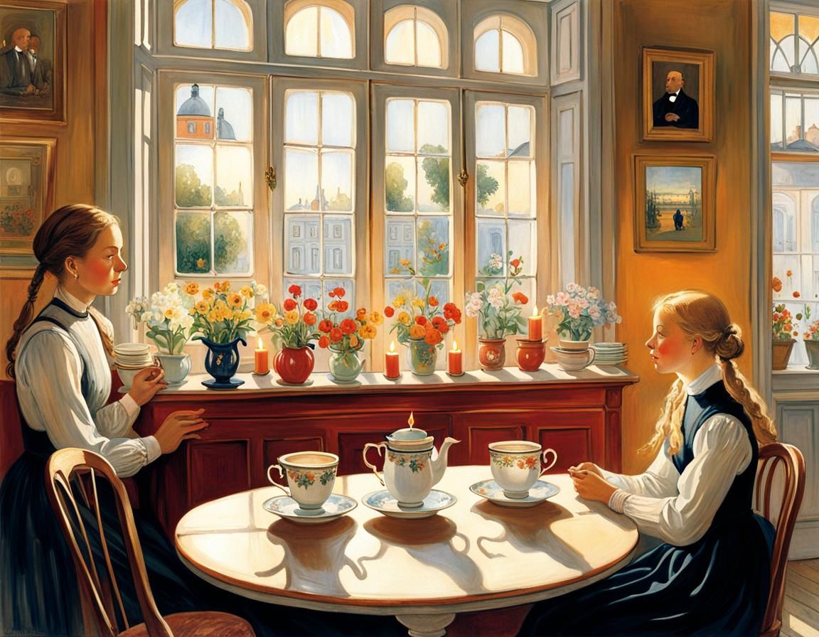 This warm image depicts a group of people enjoying each other's company in a charming café with antique decor, surrounded by candles, fresh flowers, and the gentle glow of the evening sun.
