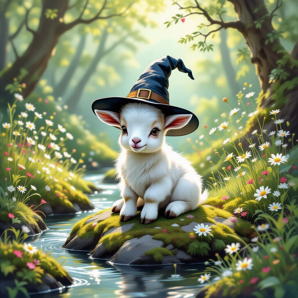 This image shows a baby goat wearing a witch's hat in an ancient forest. Soft light dapples the mossy stones and wildflowers in this fantasy illustration with vivid colors.