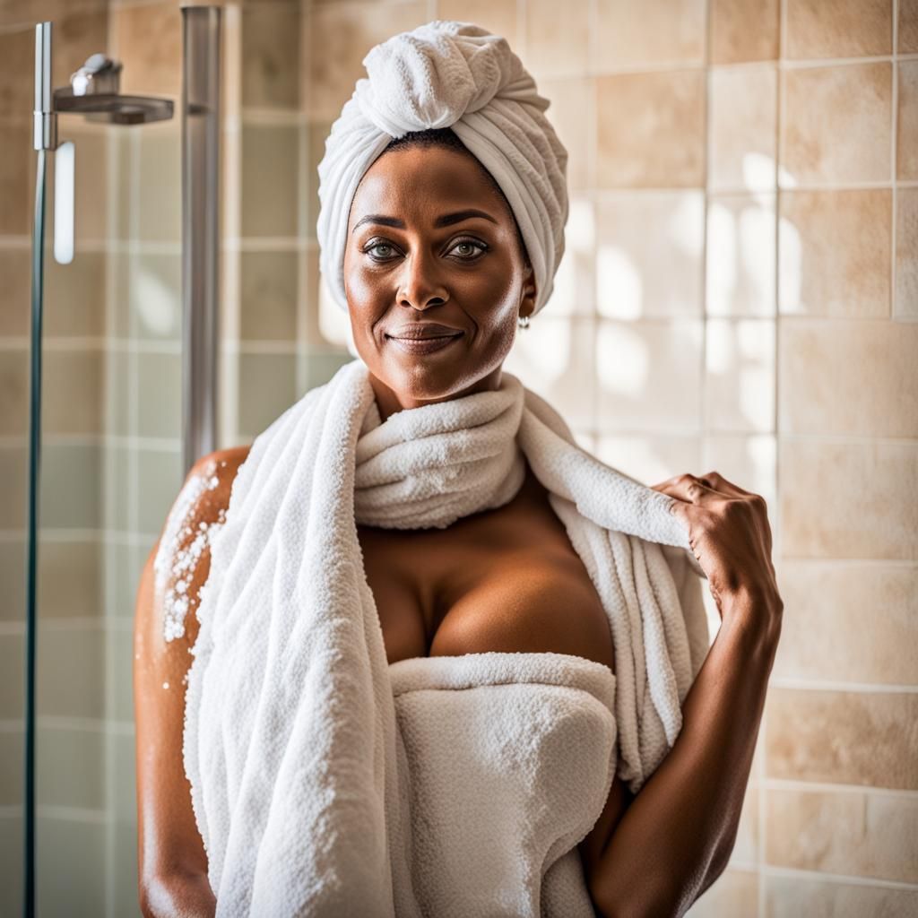 This image depicts a charming woman with dark, curly hair emerging from a shower. She's drying herself with towels, water droplets still clinging to her skin, captured in a professional photograph with a bokeh effect.