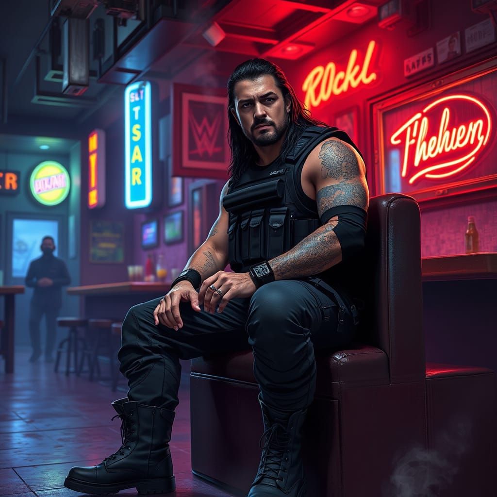 This image captures a brooding figure in a dimly lit strip bar, surrounded by neon signs and the hum of seductive music, with a gritty realism and moody atmosphere reminiscent of futuristic noir artwork.