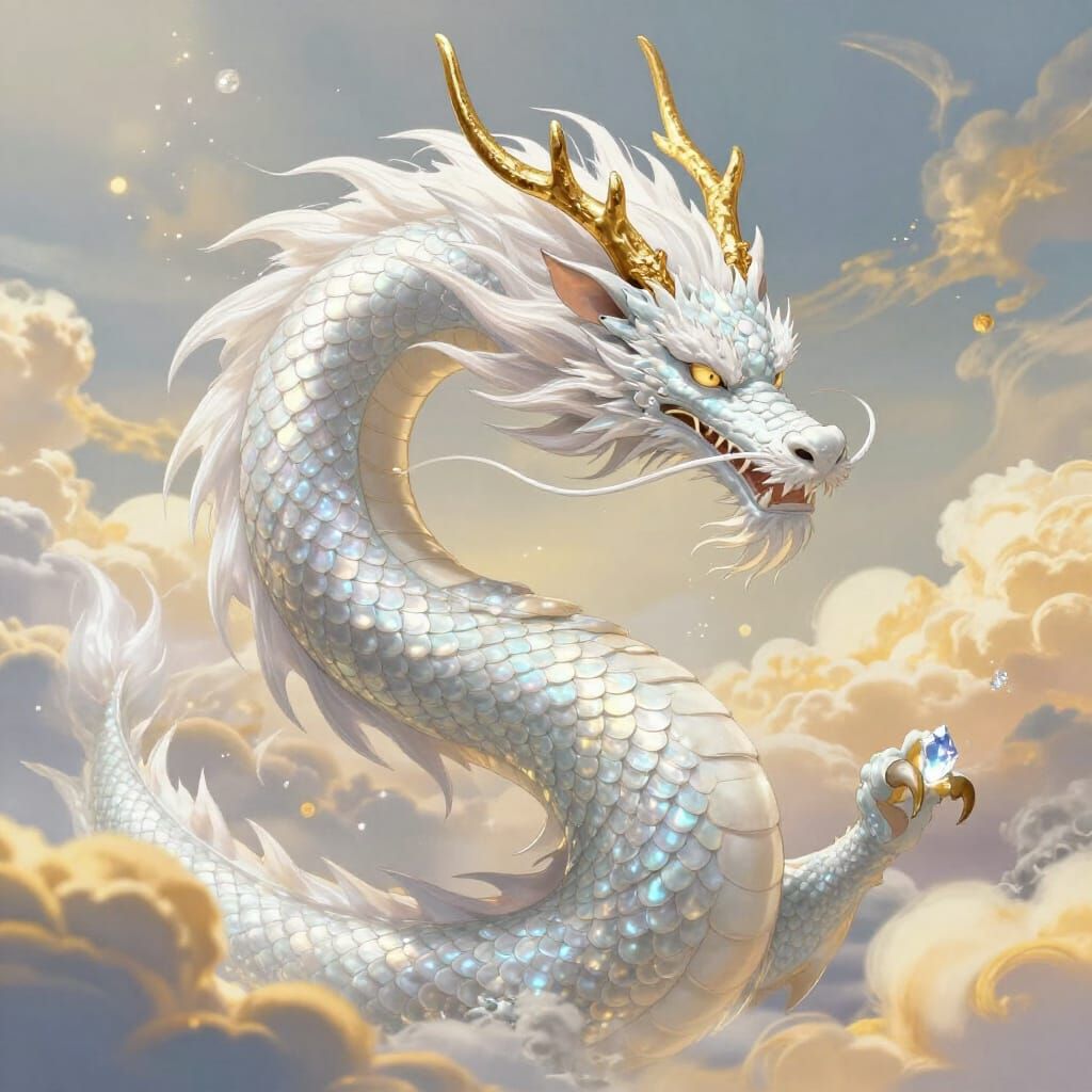 This image features a luminous Eastern dragon with pearlescent scales and flowing whiskers, navigating golden clouds. The artwork has a dreamlike, stylized anime aesthetic with soft lighting and particle effects.