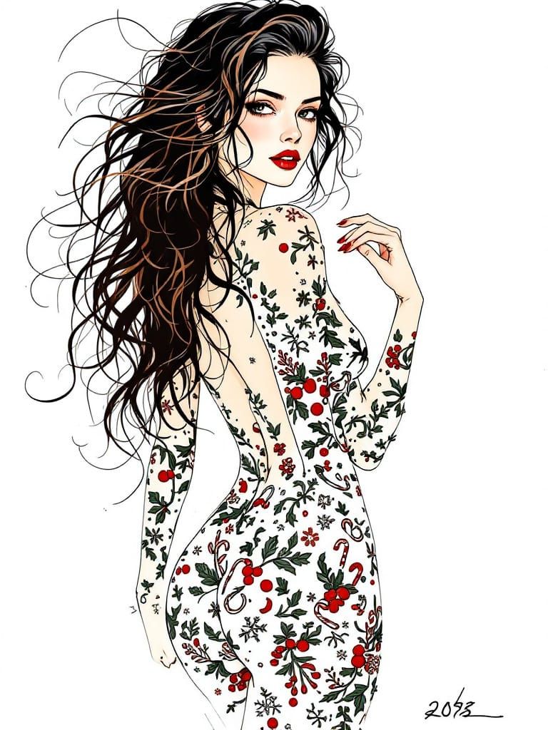 This image features a slender woman in a playful pinup pose, wearing a detailed Christmas-patterned bodysuit. The artwork uses bold, flowing lines and negative space, reminiscent of early 20th-century expressive art styles.
