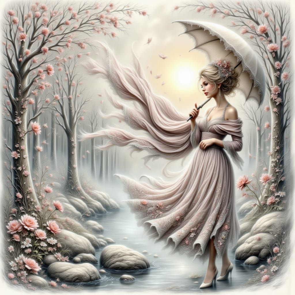 This image showcases a minimalist figure of a woman in a party dress and shawl, walking by a creek. Rendered with thick gouache textures on canvas, it evokes Fabergรฉ-style delicacy and impressionist maximalism.