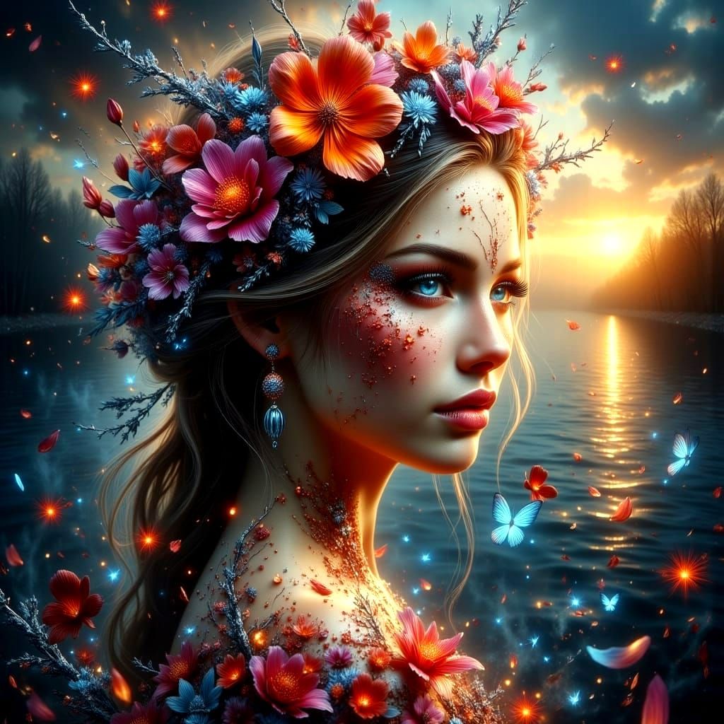 A stunning image of a woman wearing a beautiful spring crown made of colorful flowers and ferns, set against a dramatic backdrop of a setting sun and swirling petals.