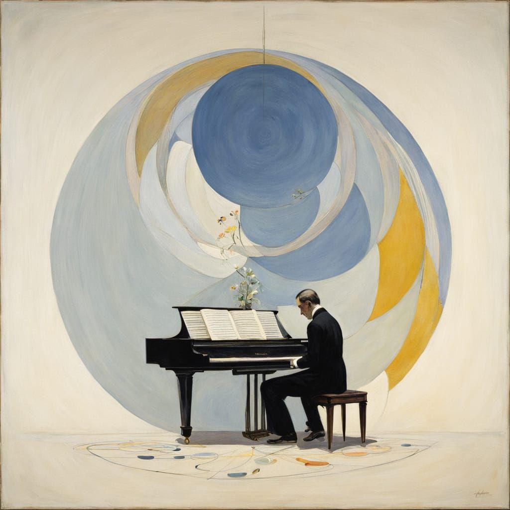 This image captures a pianist in a moment of deep emotion while playing. The art style is refined hyperrealism, evoking a contemplative and dramatic atmosphere.