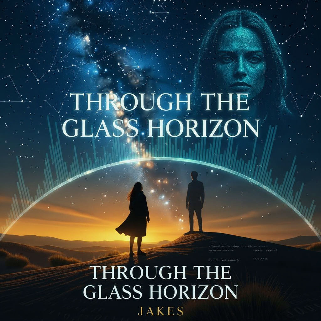 This atmospheric cover art depicts a lone woman on a desert ridge, gazing at a midnight blue sky filled with stars and subtle geometric patterns, with a distant figure hinting at sci-fi mystery.