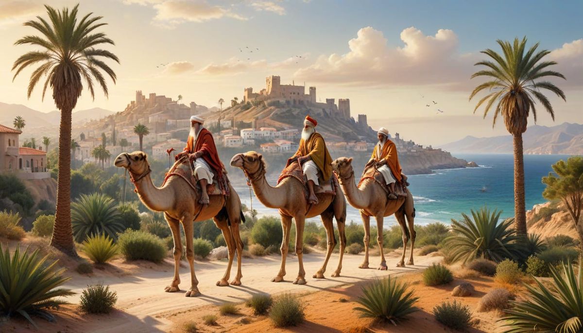 This image depicts the Three Wise Men traveling by camel through a Mediterranean landscape, evoking a sense of hopeful anticipation. Features realistic coastal elements and a warm color palette.
