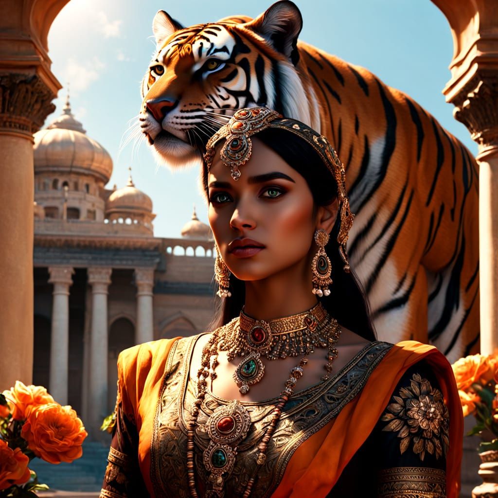 This hyperrealistic image depicts a regal Indian princess in ornate jewel-toned attire with gold embroidery, standing beside a majestic Bengal tiger in an opulent palace courtyard. The scene features warm, soft lighting and rich textures, creating a majestic and culturally rich atmosphere.