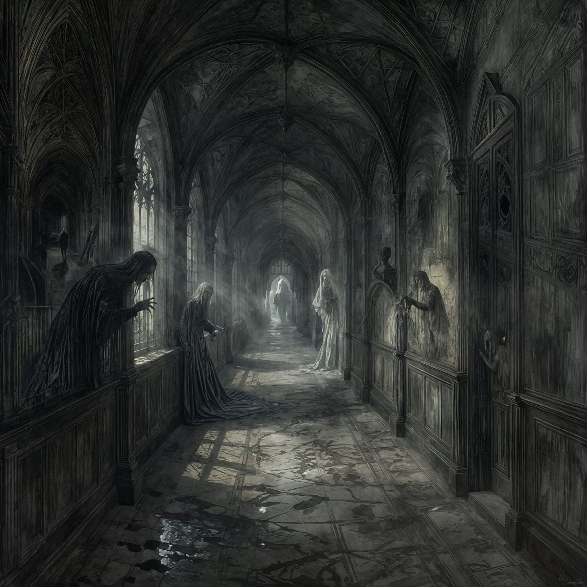 This image depicts a dimly lit, haunting corridor with flickering shadows, rendered in a painterly gothic style with wet-on-dry watercolor oils.