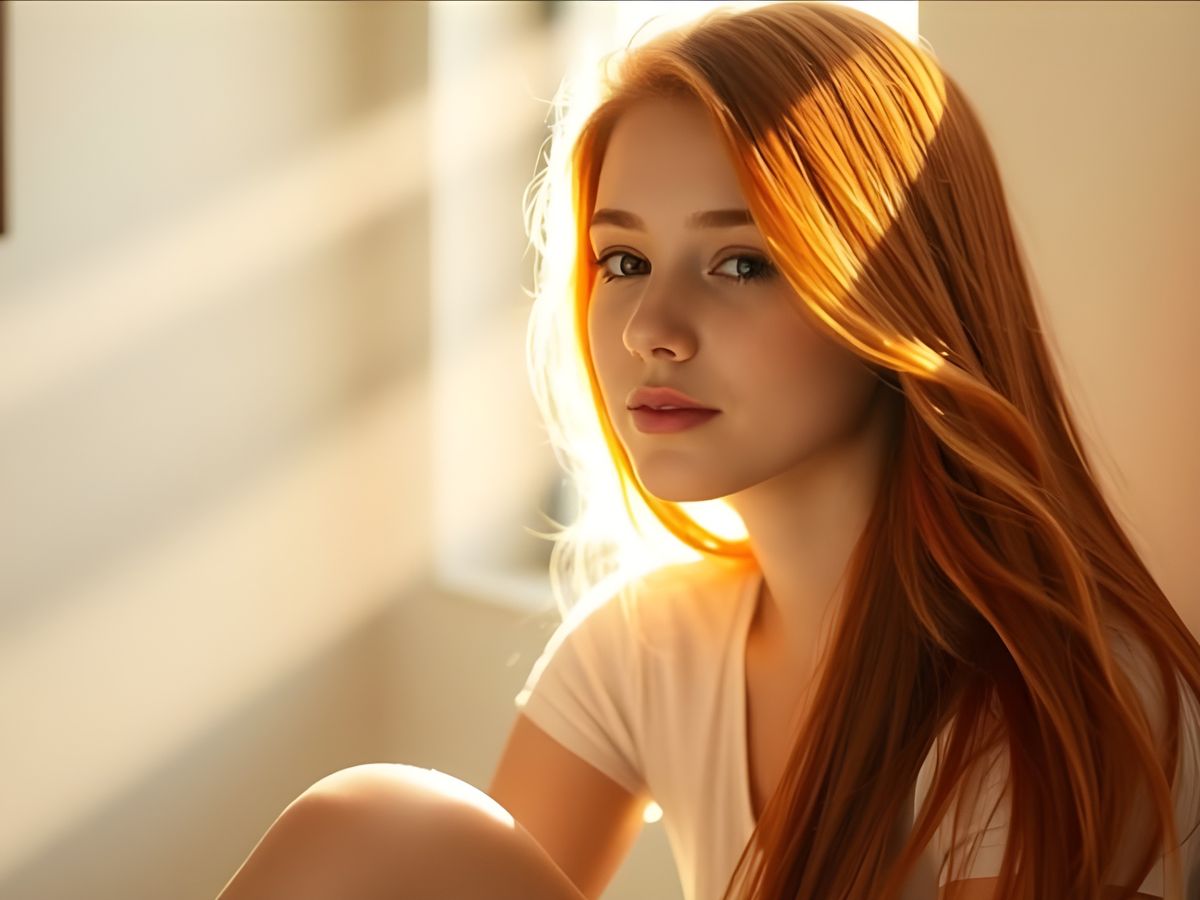 A vivid image of a young woman with long red hair, illuminated by a beam of sunlight streaming through a window. The scene evokes a sense of warmth and tranquility.
