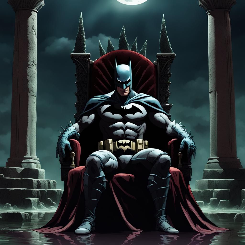 A highly detailed digital painting of Batman sitting on a stone throne. The image shows a zombie-like, bloodied version of the character in a dark, fantastical setting with a rising moon.