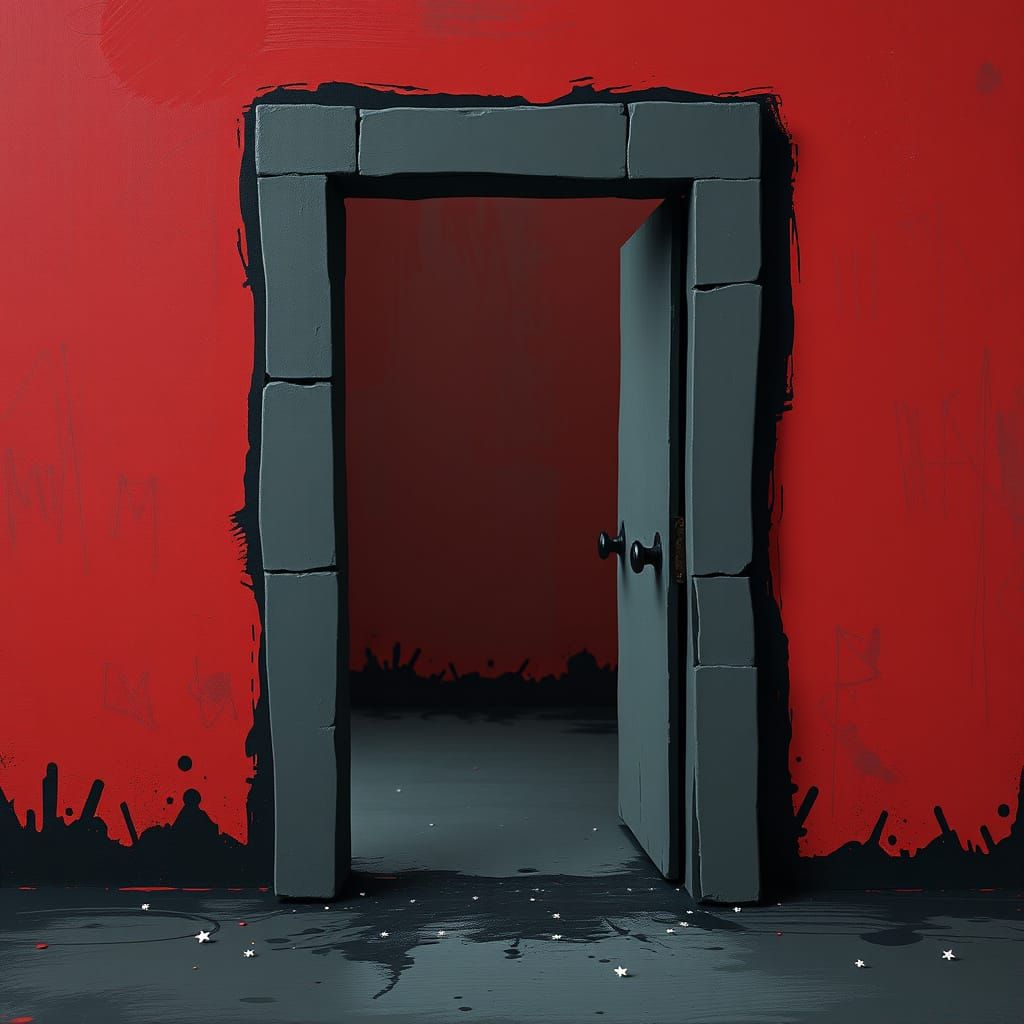 A distorted funhouse mirror reflects a midnight scene. The interior wall features red and grey tones with black smears, a stick figure silhouette, and tiny white stars.