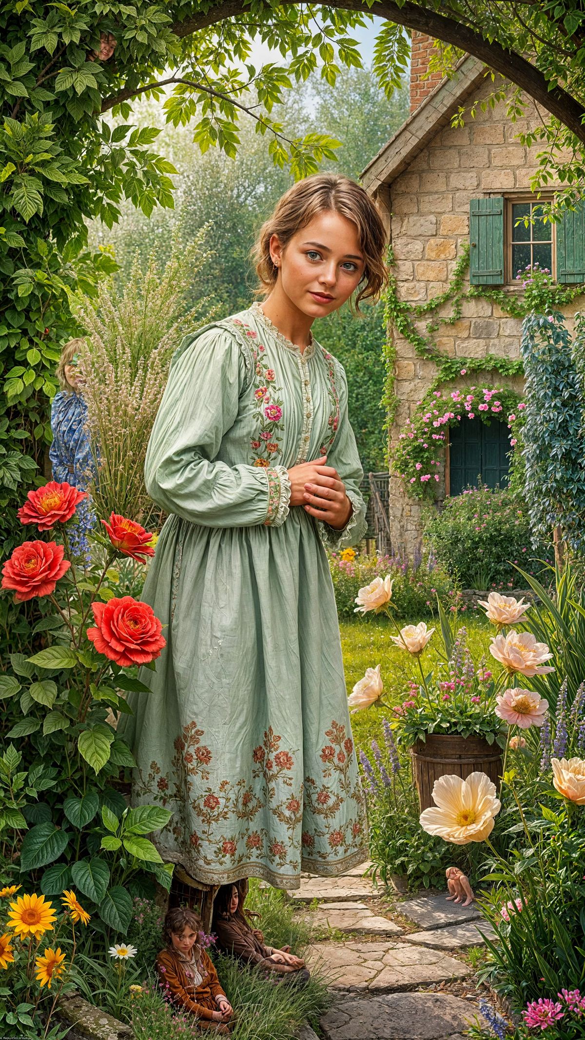 This image shows a kind young woman in vintage clothing standing in an old-fashioned cottage garden. The photorealistic image is finely detailed and textured.