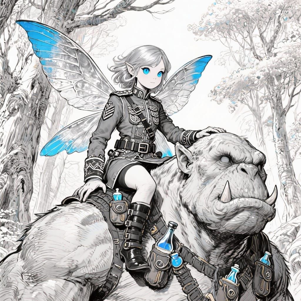 A tiny fairy with silver wings and blue eyes rides a giant ogre in a forest. Rendered in a pen and ink style with a limited color palette.