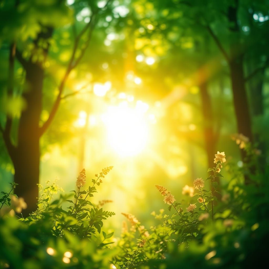 A concept art piece featuring vibrant green colors and warm sunshine. The image blends sharp and soft focus with watercolor textures, in an ethereal art nouveau style.