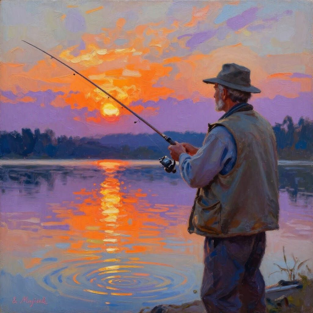 This image shows a man fly fishing on a lake during a vibrant sunset. Rendered in a rich, impressionistic oil painting style with visible brushstrokes and warm colors.