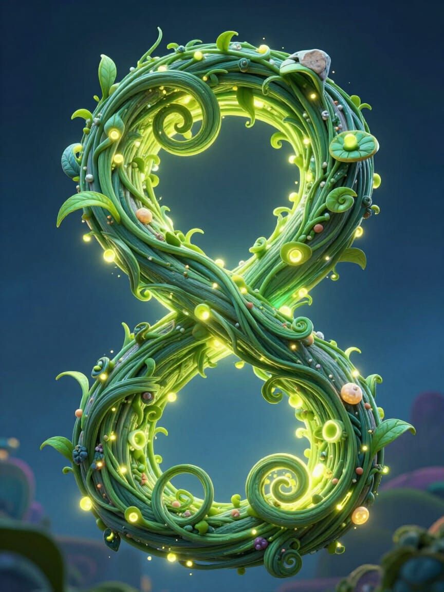This 3D render showcases glowing Fibonacci vines forming an infinity stone. Features a vibrant, magical aesthetic with cinematic lighting and immense power.