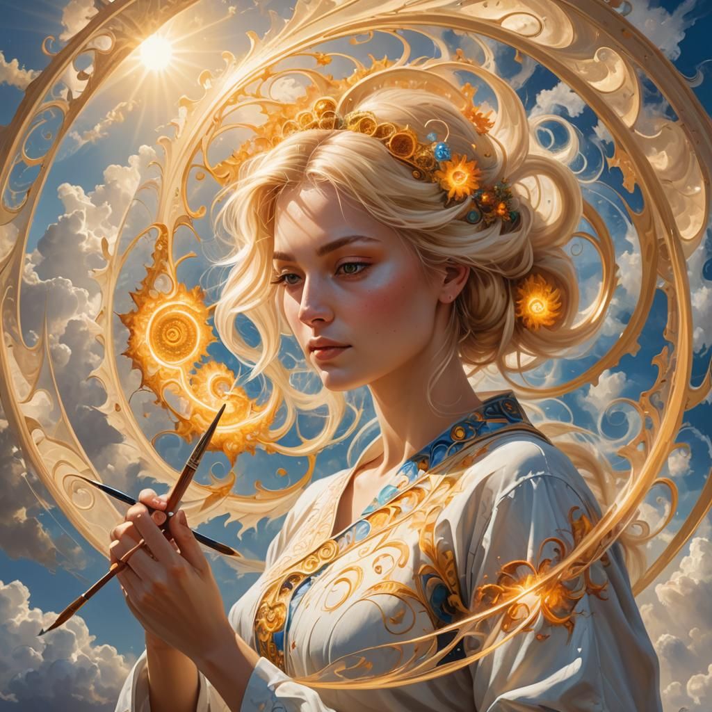 This image depicts a young, blonde woman painting a Fibonacci spiral with a brush, set against a backdrop of sunlit clouds. The scene is rendered with soft focus and divine lighting.