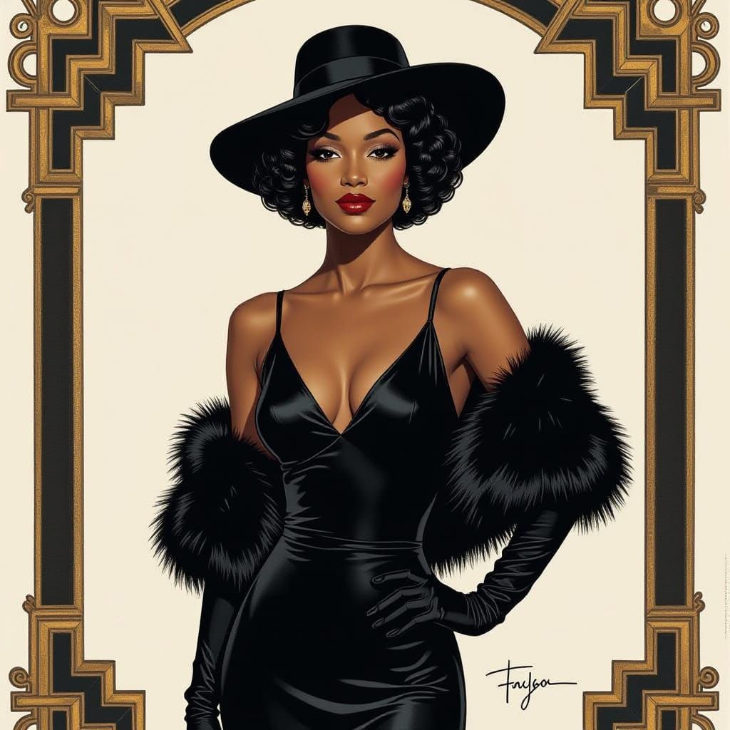 This image shows a waist-up monochrome portrait of an African American woman. The subject wears a black hat and fur bolero, set against an Art Deco frame, rendered with glossy textures.