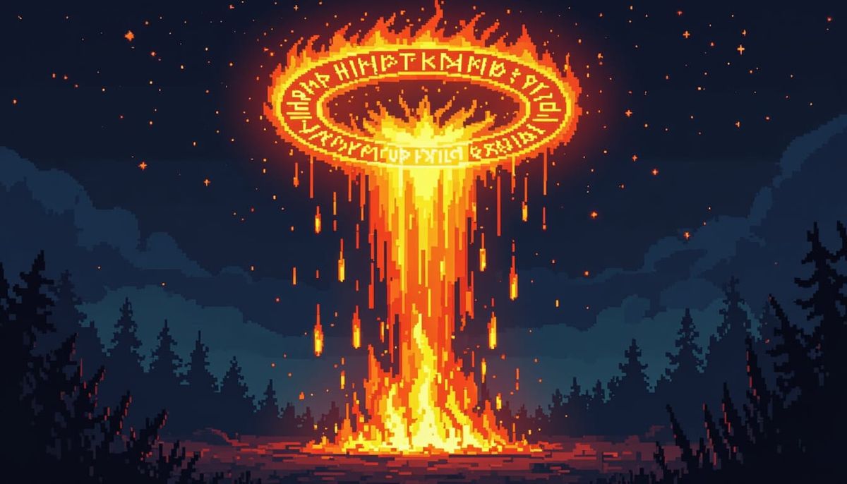 This image shows a pixel art depiction of a fire rain spell. Burning meteors fall from the sky, accompanied by a glowing magic circle with runes, creating a dark fantasy atmosphere.