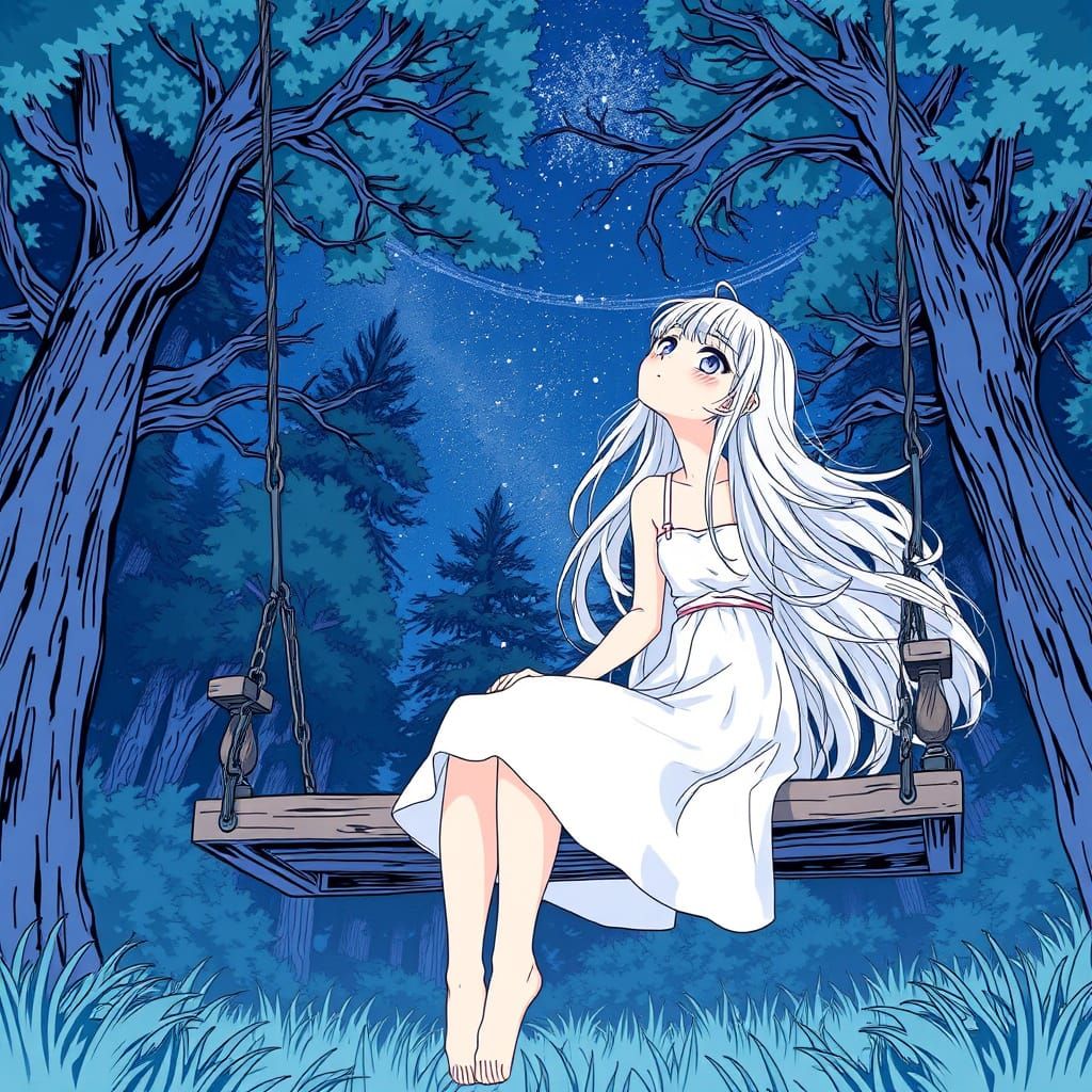 This serene anime sketch art piece depicts a girl with long silver hair, lost in thought on a weathered swing set, surrounded by lush greenery and a star-filled night sky. Soft, diffused lighting and bold outlines create a dreamy, ethereal atmosphere with a blend of traditional and digital media.