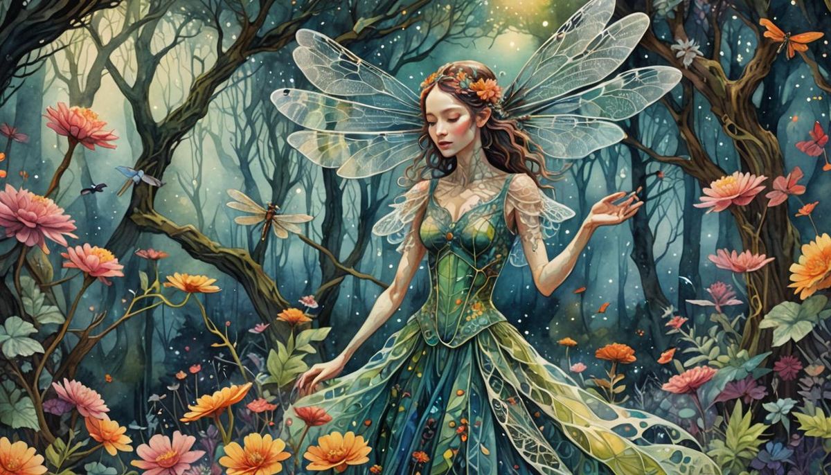 A striking picture of a dragonfly-human hybrid woman in a magical forest. She wears an elegant dress while dancing amidst flowers and mystical creatures, set against fractal tree branches. The image is a vivid watercolor illustration.