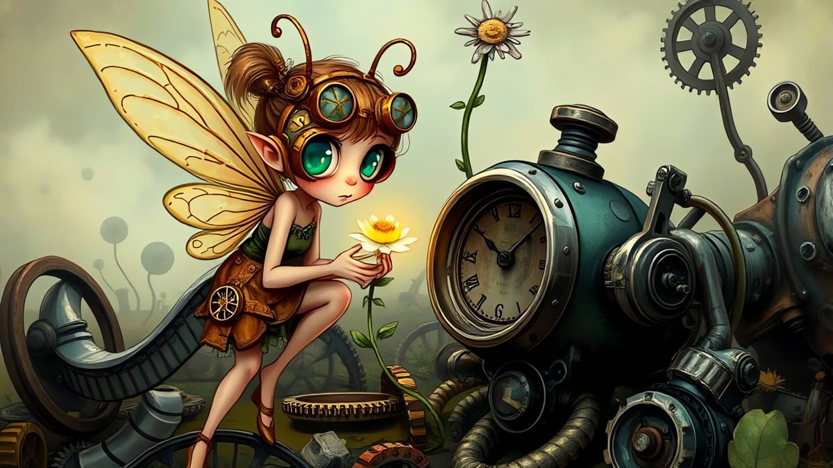 A whimsical fairy, adorned with intricate brass goggles and tiny clockwork wings, inspects a delicate, bioluminescent flower growing from a discarded automaton in a forgotten junkyard. Twisted metal and discarded gears form the landscape, hinting at a fallen steampunk civilization. The art style is a ...