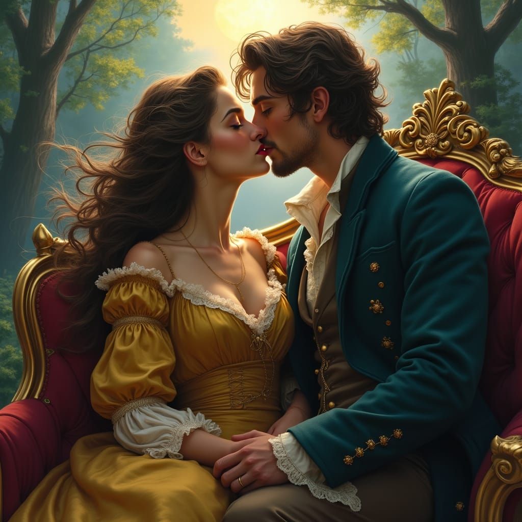 This enchanting oil painting depicts a handsome highwayman sharing a romantic kiss with a beautiful lady in a lavish, moonlit carriage, set amidst a mystical forest, with soft, golden lighting and vibrant, opulent colors.