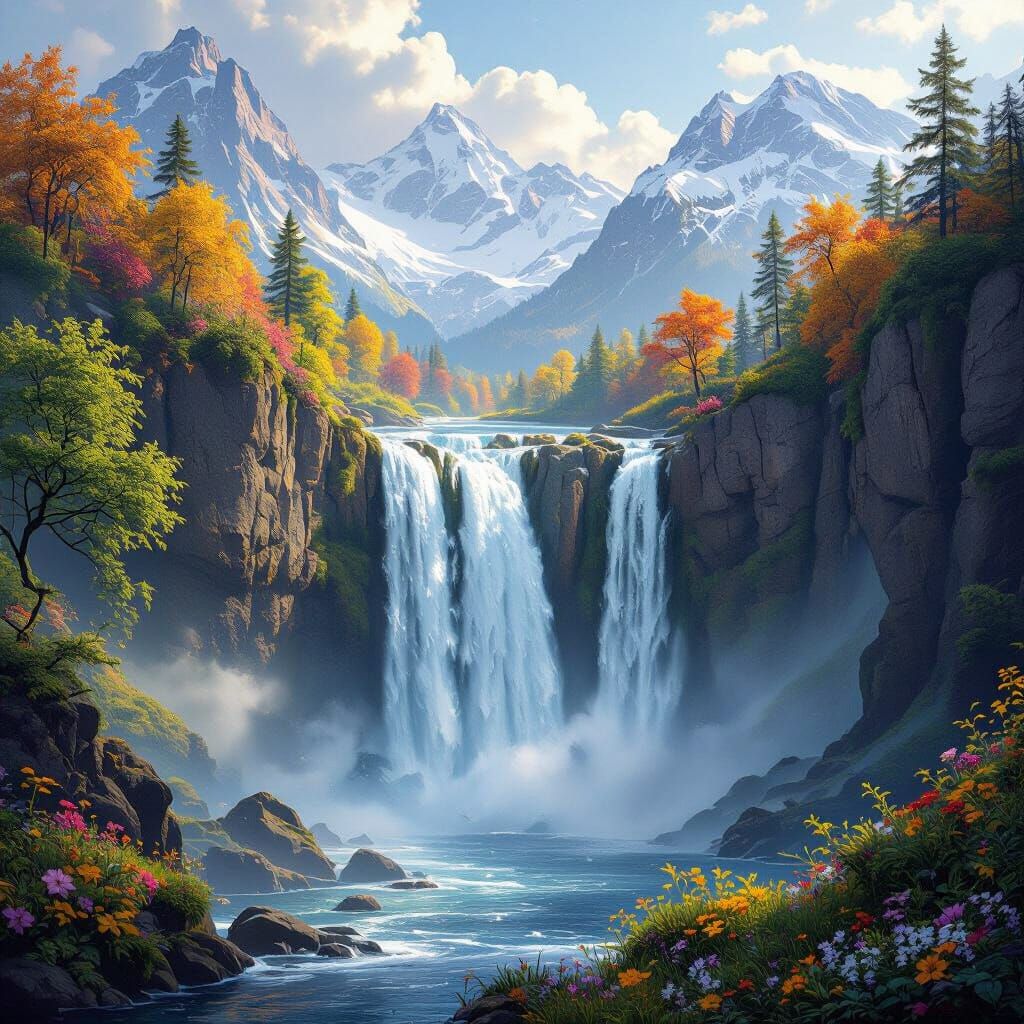 This image displays a majestic waterfall in a landscape that beautifully blends spring, autumn, and winter. Rendered in a luminous, highly detailed digital matte painting style with atmospheric lighting.