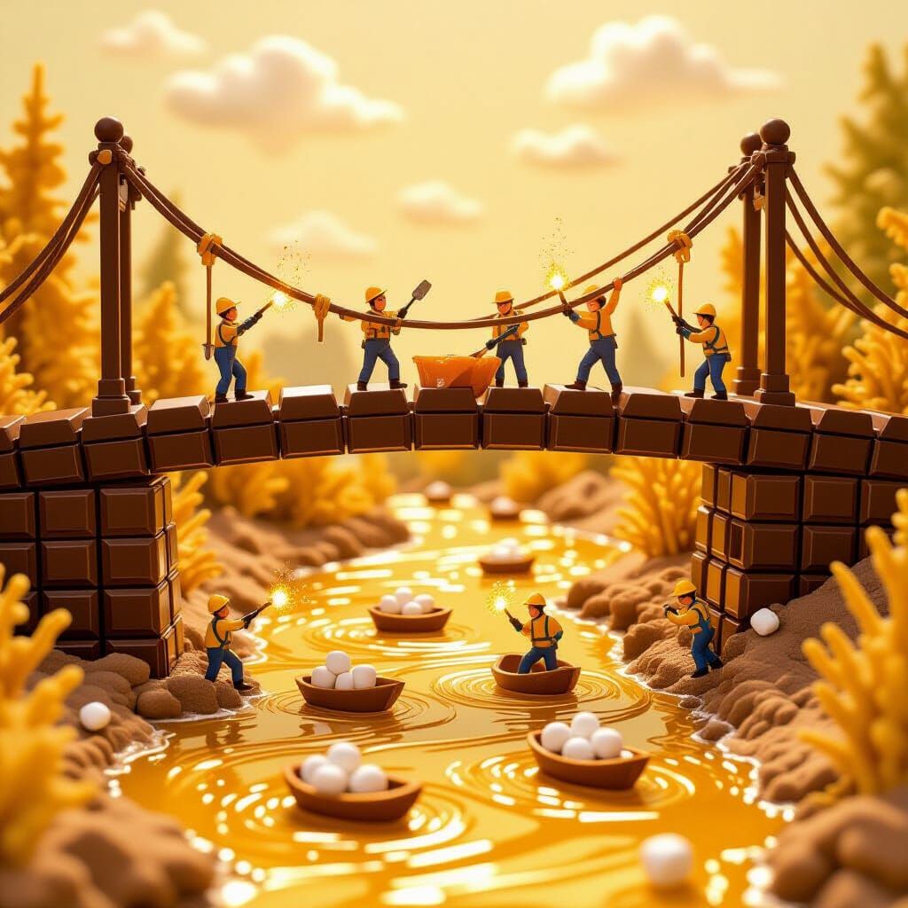 This image shows tiny construction workers building a bridge from chocolate bars and licorice, with caramel beams being melted. A river of chocolate flows below. Concept art style, highly detailed, whimsical, and warmly lit.
