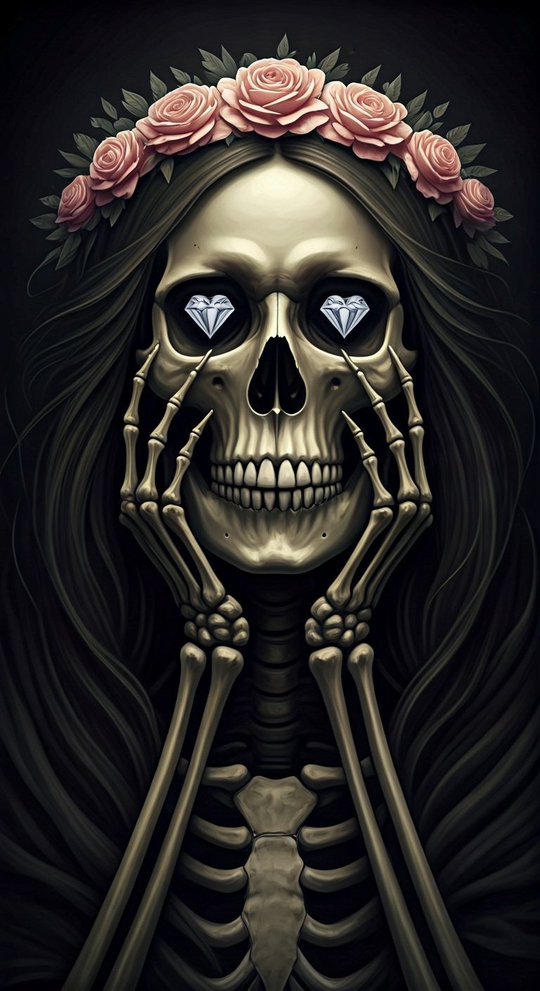 A striking picture of a skeleton adorned with a flower crown. The skeleton's hands clutch its face, and its eyes gleam as diamond hearts in a dark, ominous scene. The image has a mystical aesthetic.