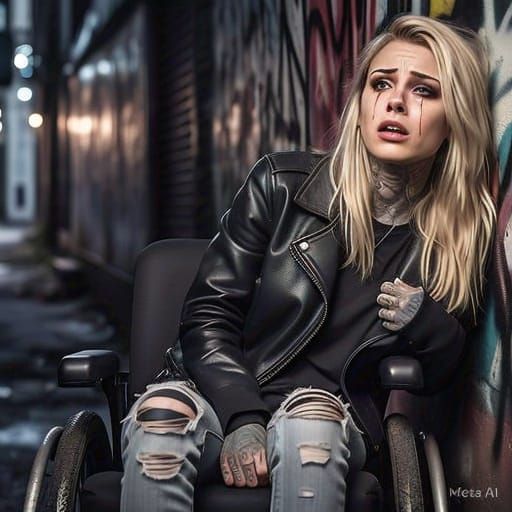 This image shows a young woman with vibrant pink and blue hair, many tattoos, and glowing blue circuits on her wheelchair, set against a moody, neon-lit cityscape at night.