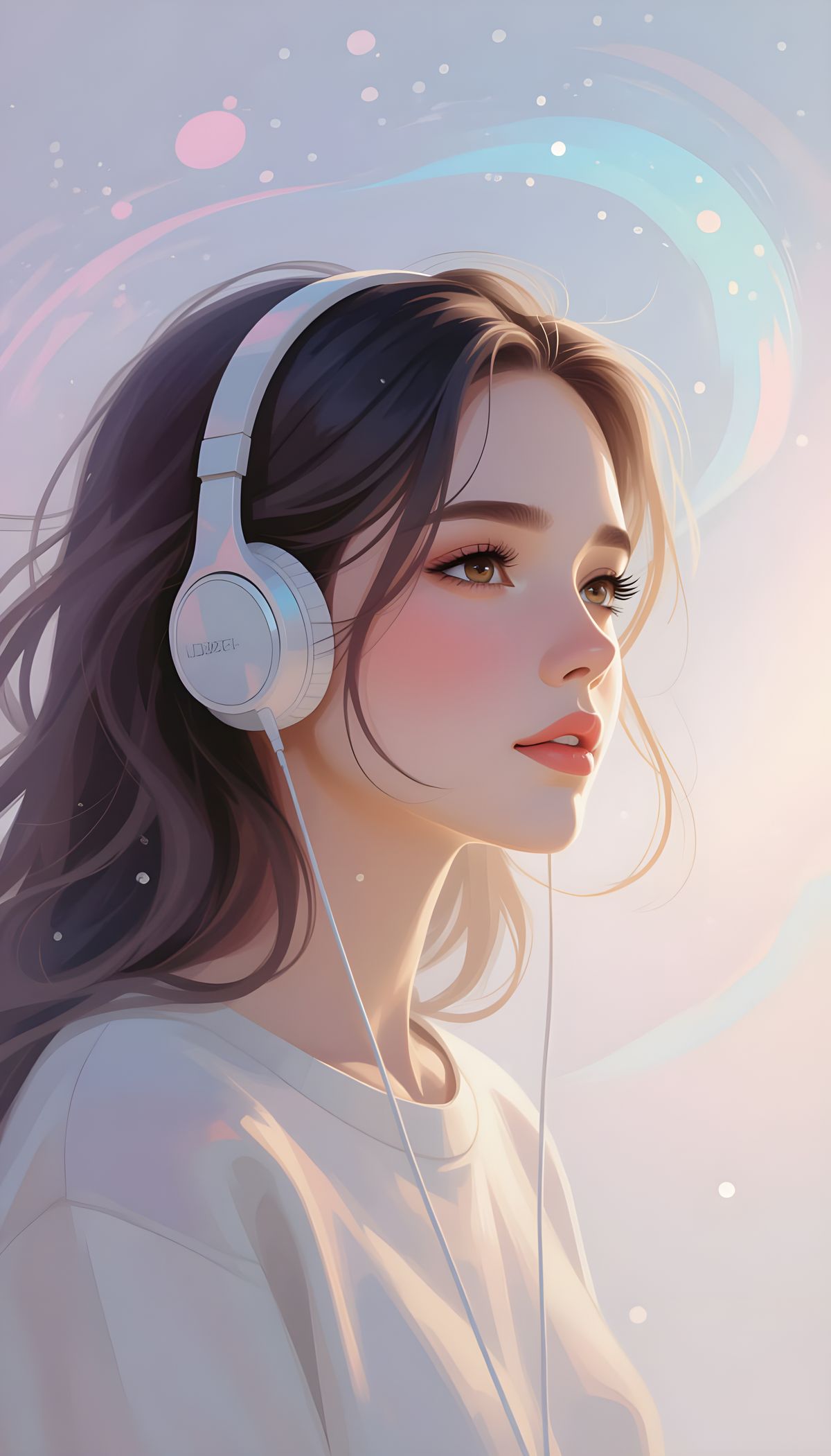 This image depicts a girl wearing earphones, engrossed in thought and seemingly lost in a blurred, dreamlike world. The visual evokes a sense of introspection and imagination.