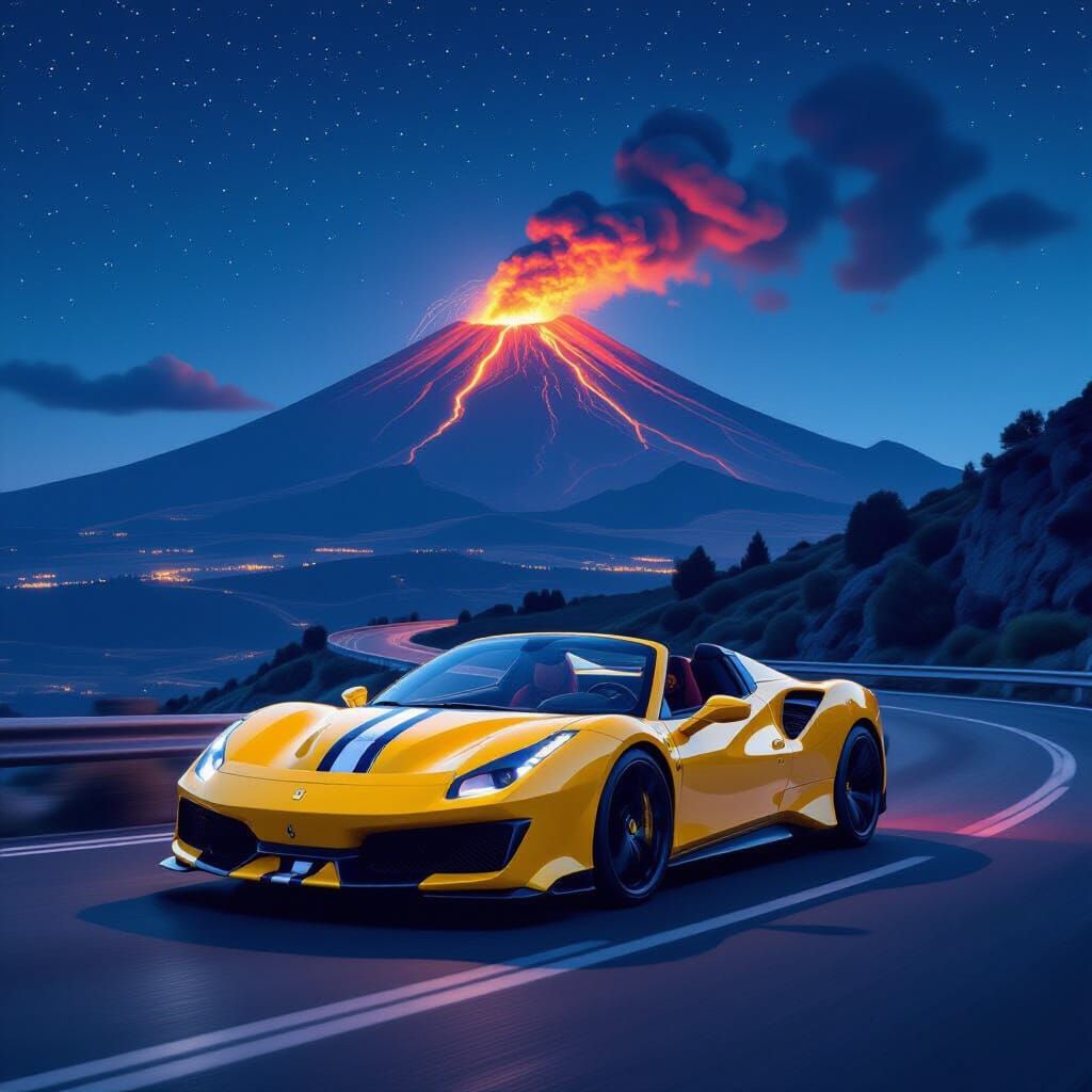 This image shows a yellow Ferrari 488 Pista Spyder driving on roads near the erupting Etna volcano at night. The scene is rendered with vibrant colors and dramatic lighting, in a style evoking cinematic realism.