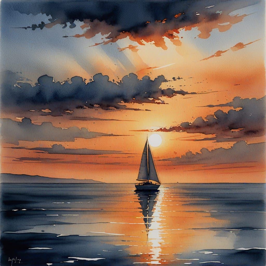 This watercolor painting depicts a dark sailboat silhouette against a vibrant sunset sky over a calm sea. The water mirrors the fiery oranges and reds, with a glowing sun on the horizon.